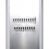 Wyjątkowo ostre i wytrzymałe ostrza z wysokiej jakości stali nierdzewnej do przygotowania dekoracyjnych pasków z marchwi, selera, ziemniaków, białej rzodkwi itp. Pokrowiec ochronny pełni także funkcję pojemnika na starte produkty. Ostrza tarki są wyjątkowo ostre. Tarkę należy zawsze przechowywać z nałożonym pokrowcem ochronnym.