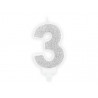 Świeczka urodzinowa cyferka 3 - PartyDeco - brokatowa, srebrna