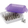 Pudełko do przechowywania tylek cukierniczych renomowanej firmy Wilton. Pozwala na umieszczenie w nim do 55 tylek dekoracyjnych o standardowym rozmiarze (tylki ze średnicą dolną 1,7 cm). W wydzielonej przestrzeni można również umieścić couplery, duże tylki, gwoździe cukiernicze lub inne akcesoria. Dzięki niemu Twoje tylki będą w bezpiecznym miejscu oraz unikniesz ich zgubienia. Pudełko nie zawiera tylek.