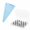Zestaw akcesoriów do szybkiego i oryginalnego dekorowania babeczek, ciast i tortów. Doskonały dla początkujących cukierników, jak i profesjonalistów. Zestaw został skomponowany w taki sposób, aby umożliwić wykonanie spektakularnych dekoracji. Idealny do tworzenia gwiazdek, rozetek, kwiatków, listków, spiralnych wzorów oraz kropek. Zestaw zawiera tylki, dedykowany adapter i rękaw cukierniczy wykonany z silikonu. Adapter mocno trzyma końcówkę nawet przy gęstym kremie, dodatkowo pozwala na wymianę końcówki bez konieczności wyciągania kremu z rękawa. Zestaw całkowicie bezpieczny dla zdrowia i neutralny dla żywności.